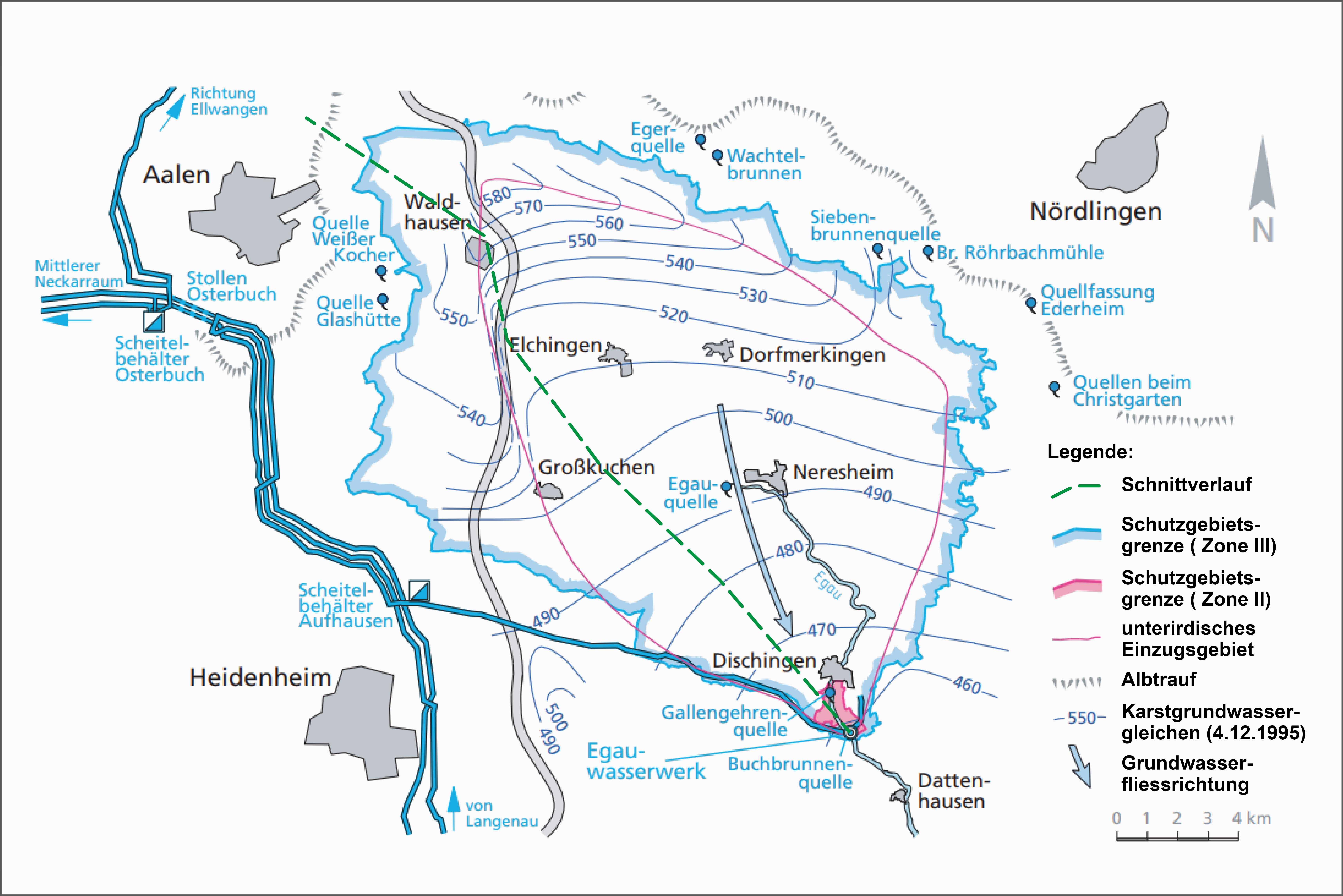 Zu demselben hydraulischen System gehören ebenfalls die höheren Teilaustritte des Karstgrundwassers nördlich Dischingen in die Vorflut der Egau. Sie beginnt bei mittleren Karstwasserständen in der Neresheimer Egauquelle und bei sehr hohen Grundwasserständen bereits an den Austritten im Kuchener Tal.